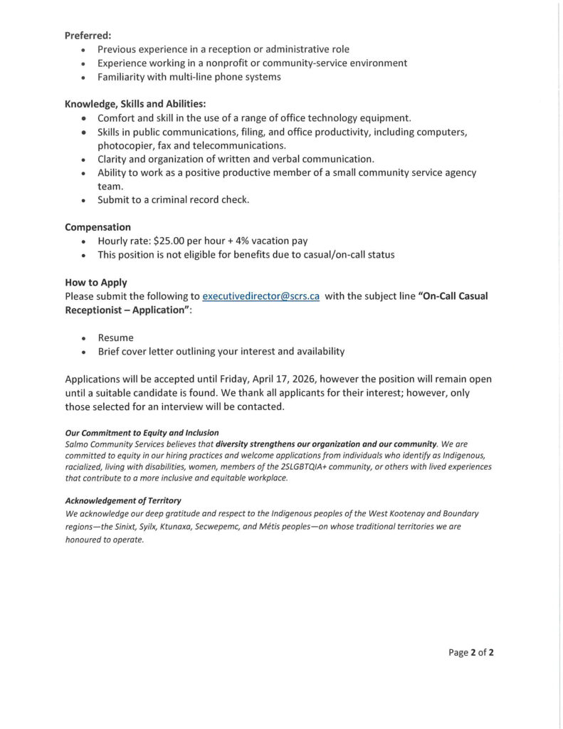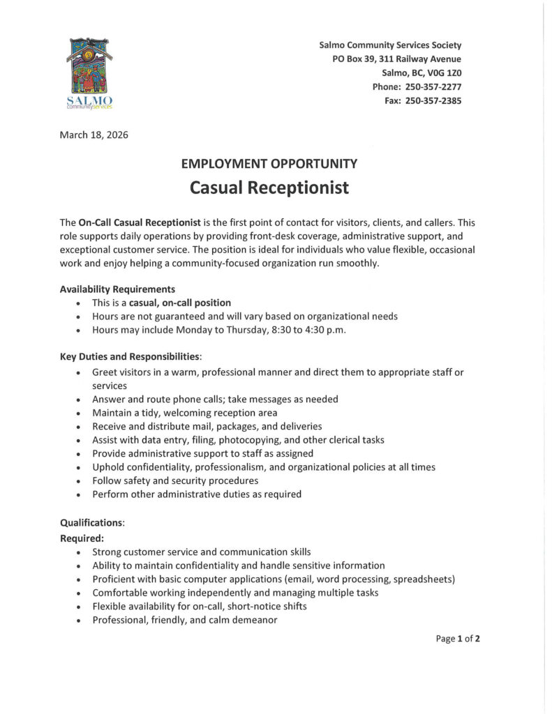 Relapse Prevention Group September 3, 2020 No Comments Read More » Dream Catcher Workshop – February 13, 2020 January 20, 2020 No Comments Read More » Childminder – Casual Coverage September 5, 2019 No Comments Read More » Three Counselling Positions Available in Salmo!!! May 16, 2019 No Comments Read More » Nobody’s Perfect Parenting April 3, 2019 No Comments Read More » Harvest Share Position Available April 2, 2019 No Comments Read More » Pres here to fill in the form and access services